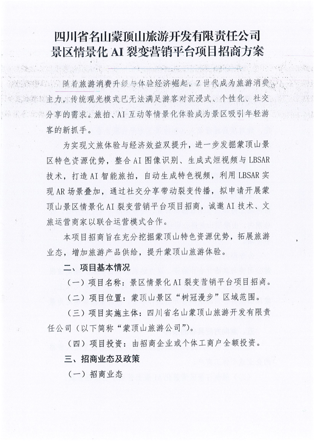 四川省名山蒙頂山旅游開發(fā)有限責(zé)任公司 景區(qū)情景化AI裂變營銷平臺項目招商